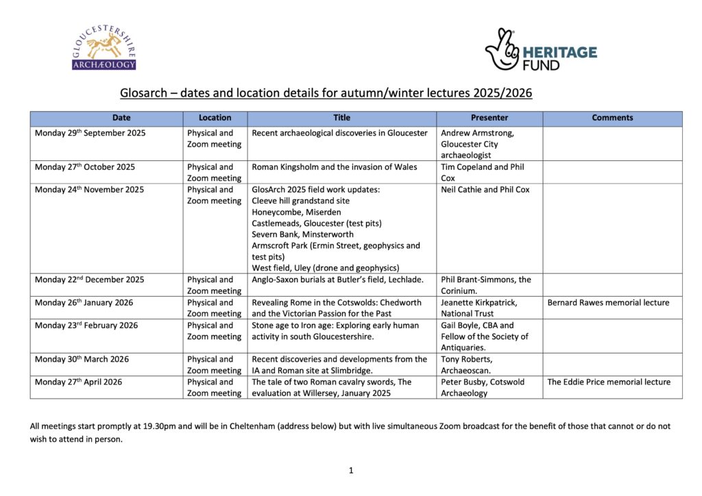 The programme for the 2025-26 lecture series, is complete and can be accessed here. Lectures are free to members and non-members (non-members are invited to make a small donation towards the cost of running the talks – £5 is suggested). Payment can be made by bank transfer to Gloucestershire Archaeology; Sort code 08-92-99; A/c no. 67285787.
