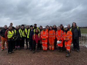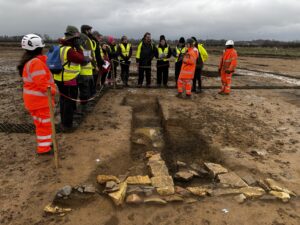 This year the “Summer” visits programme started early, with a guided walk in February, led by staff of Archeological Research Services, of the archaeological investigations at the site of the new, southbound road connection to the M5 from the A4019 at Junction 10 outside Cheltenham. The ARS team walked us around the muddy site to show us the main features they have found so far, including Roman burials, a corn drier and Iron Age ditches. Afterwards we were shown some of their key finds, including a copper bracelet, brooches and coins. Thank you to Alice Short and the team from ARS for showing us around.